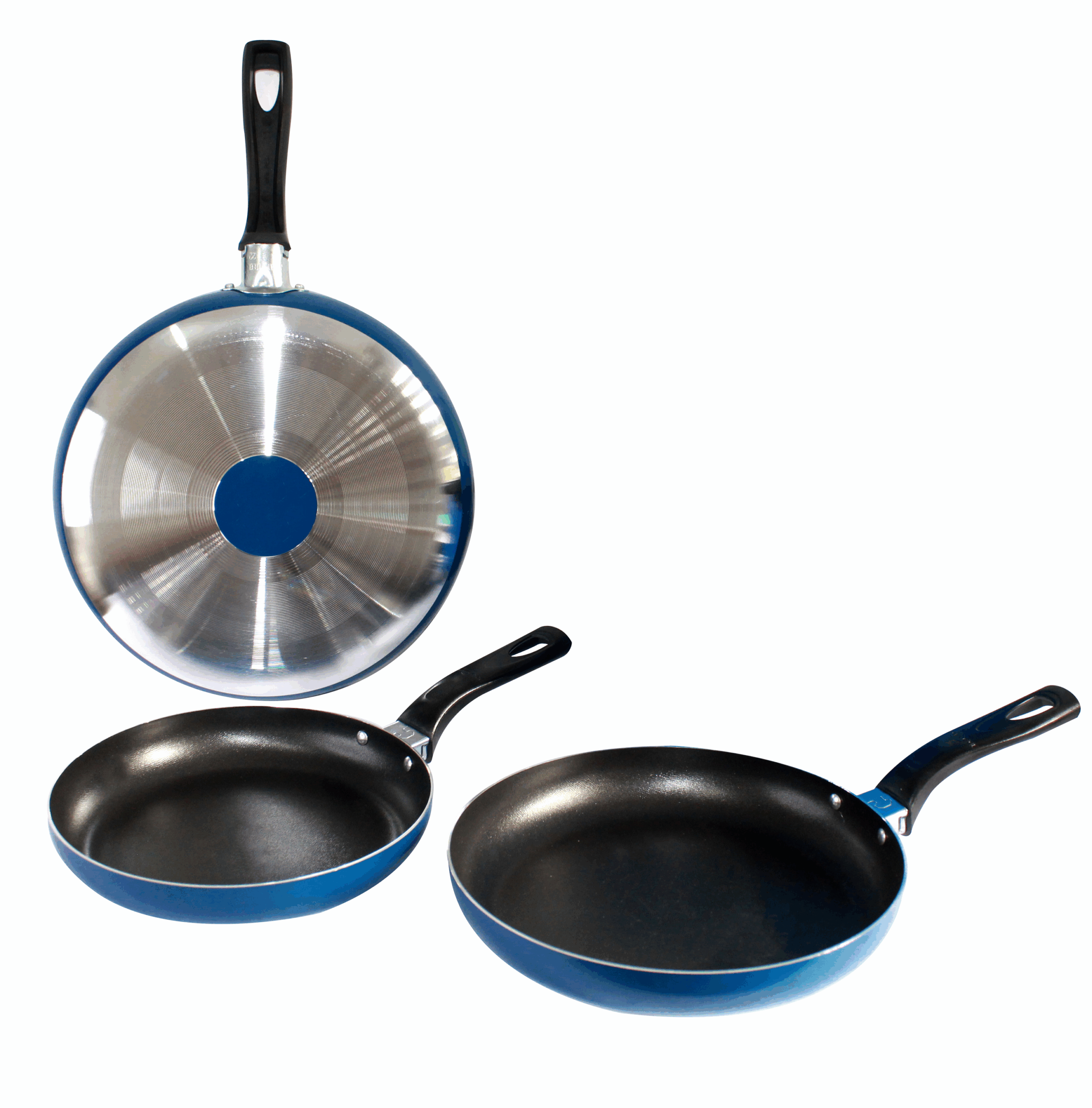 Set de sartenes con 4 capas de antiadherentes en su interior, mango de baquelita, resistente al calor y acabado exterior con pintura metalizada. Incluye en aluminio caldero #6 tapa de vidrio calibre del material 1.0 resistente con pintura electrostática para mayor duración y formadora de Hamburguesa.
