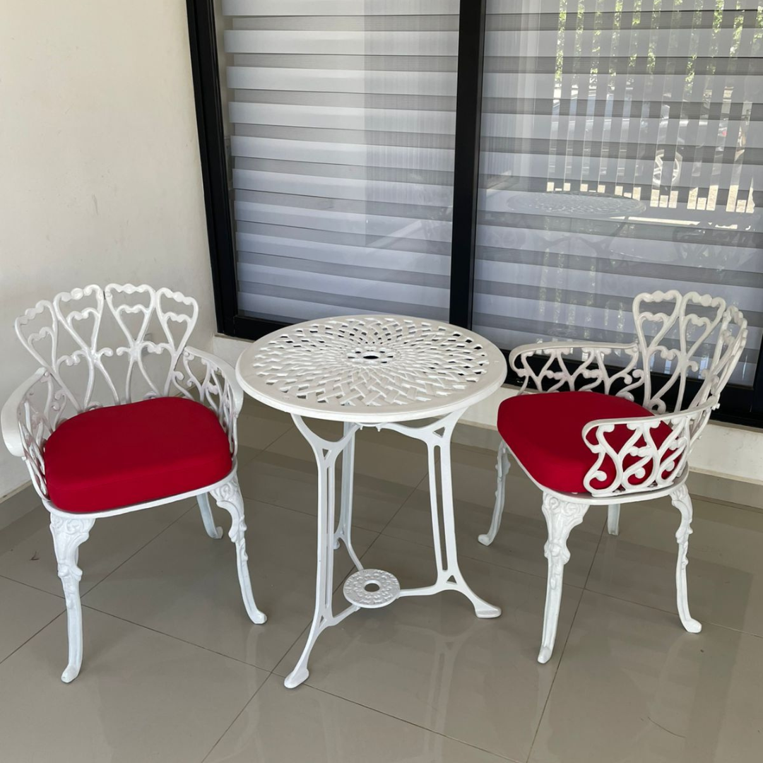 Incluye dos sillas con brazos ergonómicas y cojines en tela impermeable, pensados para tu confort y practicidad. La mesa redonda combina diseño clásico y durabilidad, perfecta para reuniones, desayunos o una tarde de café en tu terraza, balcón o jardín.